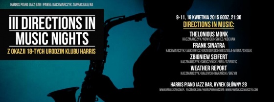 Cykl czterech koncertów rozpocznie się 9 kwietnia od projektu poświęconego muzyce Theloniousa Monka. Następnie czeka nas premierowy koncert dedykowany twórczości Franka Sinatry. Wyjątkowo zapowiada się trzeci wieczór, podczas którego zaprezentowany zostanie dorobek krakowskiego skrzypka, jednej z najważniejszych postaci polskiego jazzu - Zbigniewa Seiferta. 18 kwietnia III Directions In Music Nights zakończy kolejny premierowy koncert - Directions In Music: Weather Report. Gwiazdą projektu poświęconego słynnej amerykańskiej grupie poruszającej się w obrębie fusion i jazz-rocka będzie uznawany za najlepszego obecnie skrzypka jazzowego w Polsce Adam Bałdych.