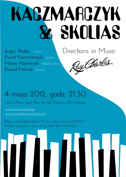 Muzyka legendy soulu i bluesa – Raya Charlesa rozbrzmiewała w piątkowy wieczór w krakowskim Harris Piano Jazz Bar. Kolejną odsłonę swojego autorskiego projektu Directions in Music zaprezentował wraz ze swoim zespołem (Maciej Adamczak – kontrabas, Dawid Fortuna – perkusja) utalentowany krakowski pianista Paweł Kaczmarczyk. Partie wokalne były tego wieczora domeną jednego z najbardziej oryginalnych głosów w polskiej muzyce – Jorgosa Skoliasa.